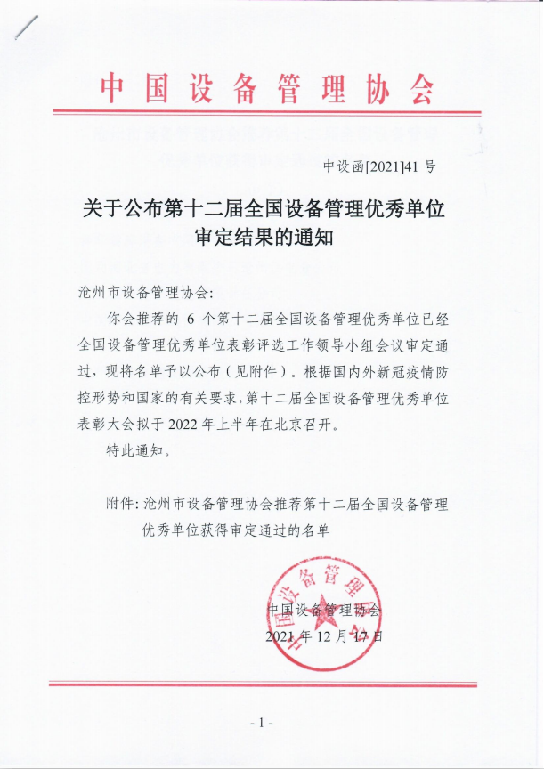 关于公布第十二届全国设备管理优秀单位审定结果的通知
